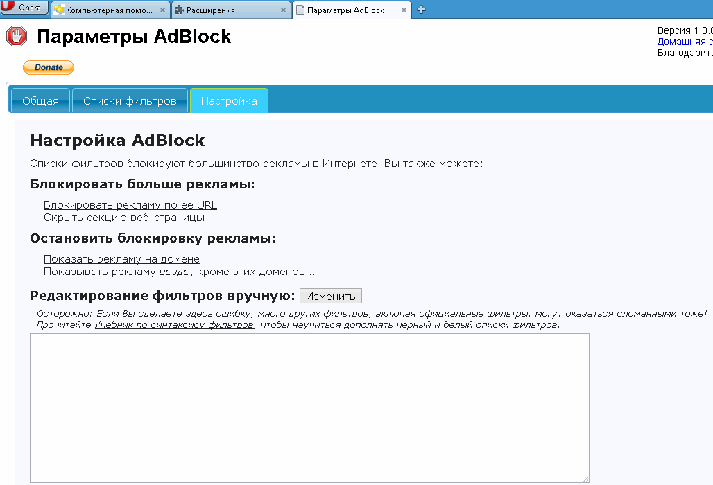 Как уже говорилось выше, расширение AdBlock не дает 100% гарантии блокирования рекламы. Некоторые могут просачиваться через эту защиту. Вот как раз в этих случаях вам понадобится вкладка Настройка. Здесь вы сможете вручную заблокировать или остановить блокировку рекламы.