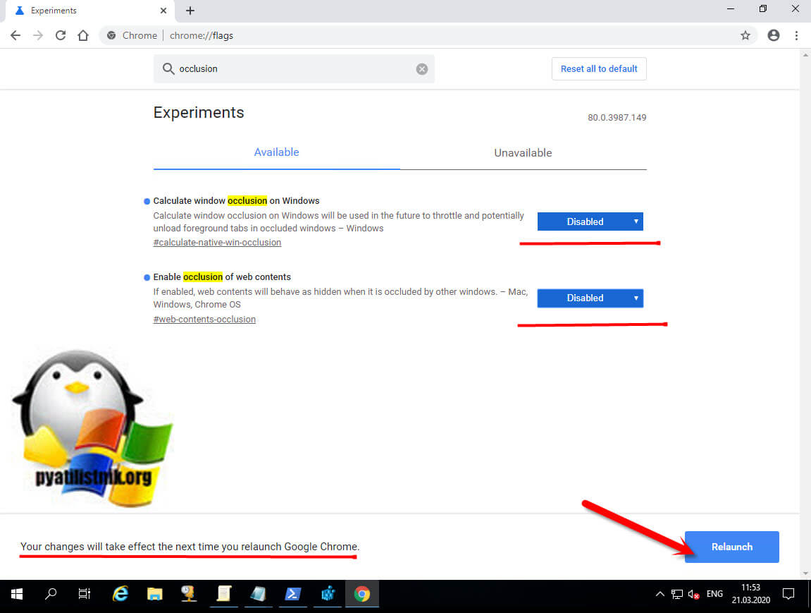 Обратите внимание, что как только вы поменяете статус запуска компонентов «Occlusion» вам необходимо перезапустить Chrome, иначе параметры не применяться в данном сеансе