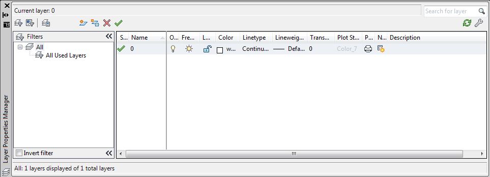 Работа с фильтрами осуществляется в Диспетчере свойств слоев (с левой стороны). По умолчанию каждый чертеж содержит фильтр «Все используемые слои», где отображаются все слои, которые присутствуют на этом чертеже.