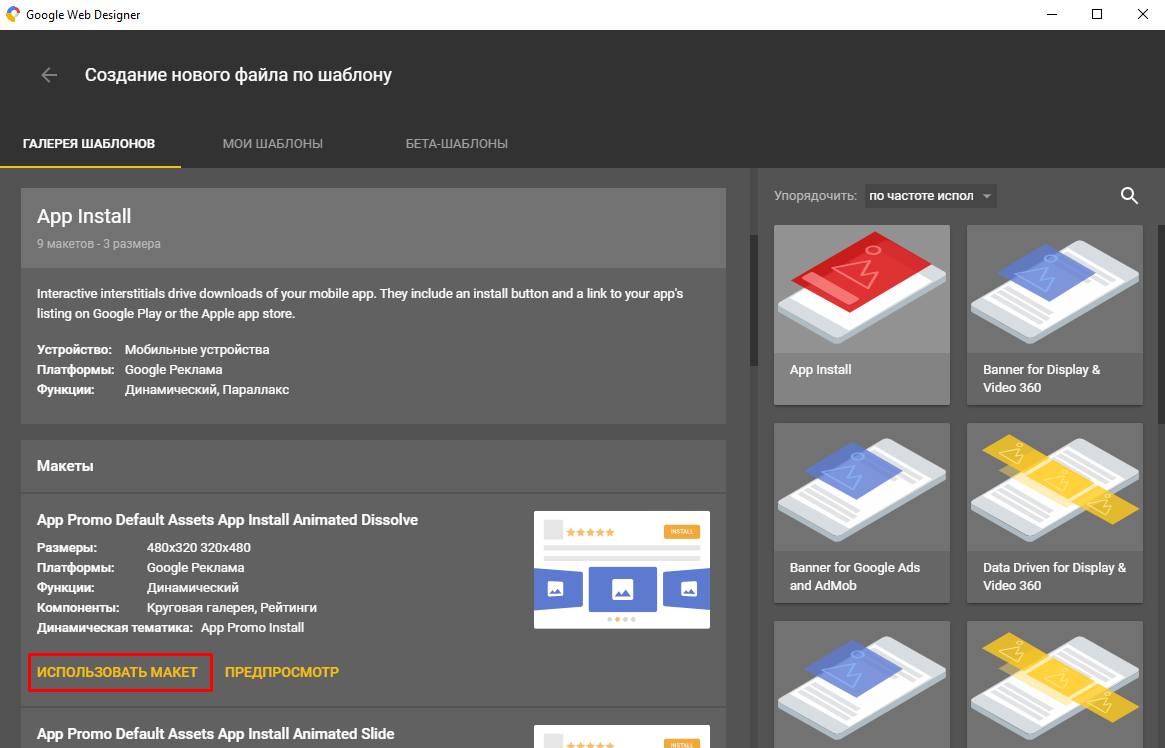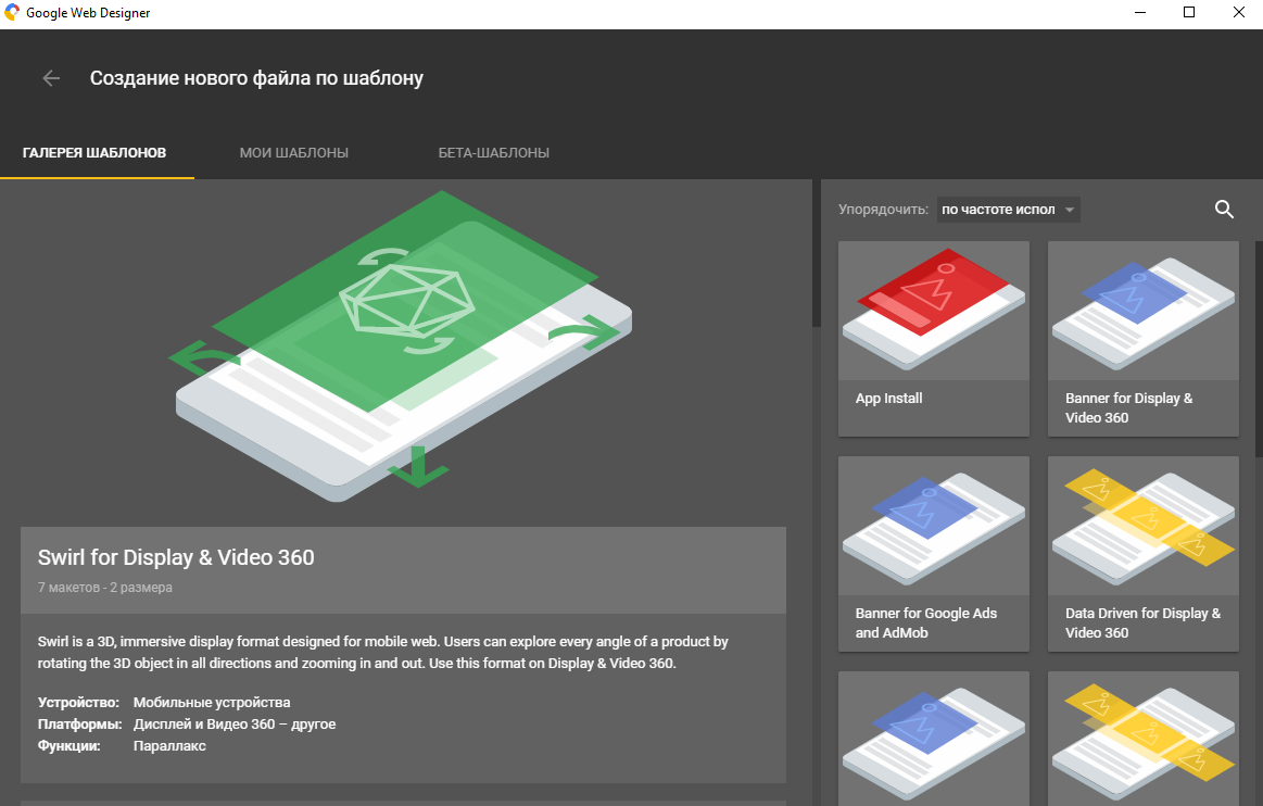 Google порадовал нас бесплатным редактором, специально созданным для реализации html-баннеров. Google Web Designer полностью заточен на реализацию рекламы, основной уклон которой направлен на AdWords. Если мы посмотрим на окно создания нового файла, заметим, что в программу уже встроены размеры шаблонов рекламы.