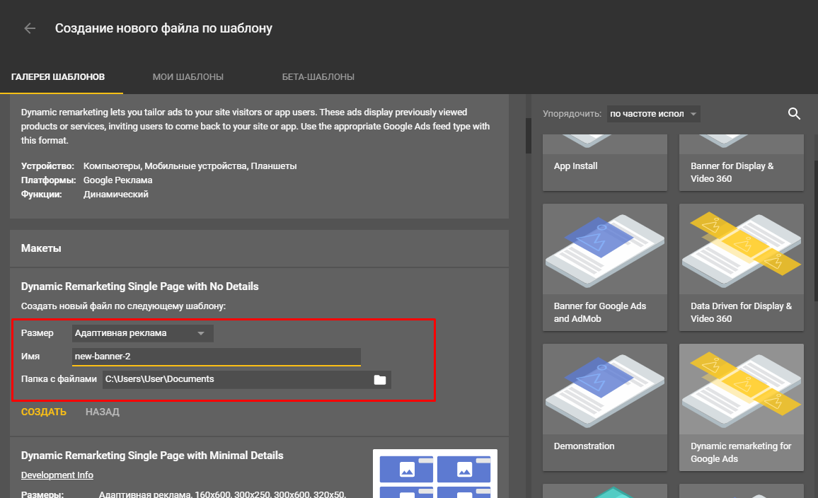 В этом случае пользователь сможет подготовить баннер под любые размеры, к тому же они будут указаны. Соответственно, мы получаем готовый список размеров, базовый шаблон, в который останется только установить собственные картинки/видео и тем самым реклама в Google Ads сможет собрать как можно больше показов при высоком значении CTR.