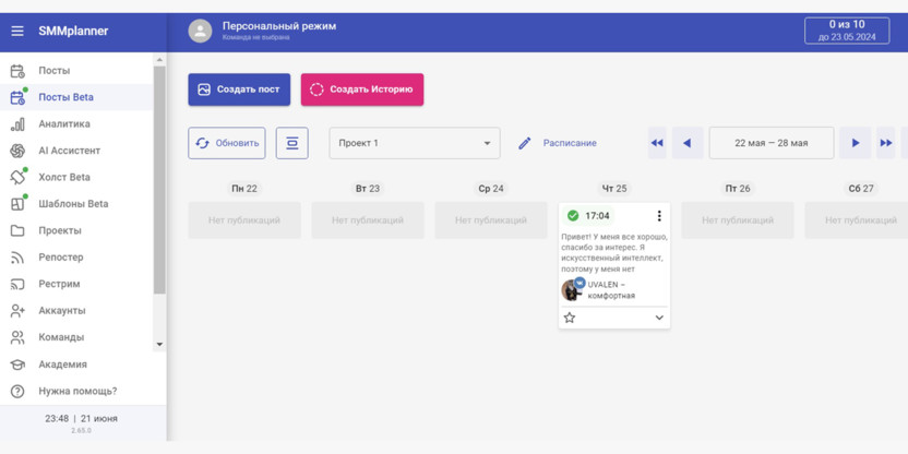 Простой и многозадачный онлайн-редактор креативов с интерфейсом ушедшей из РФ Канвы – бесплатный и на русском языке. Но если хотите использовать готовые креативы без вотермарок, потребуется купить один из про-тарифов сервиса автопостинга SMMplanner. А оно стоит того, так как кроме редактора визуала там еще куча всего полезного: автопостинг во все популярные соцсети, AI Ассистент с ChatGPT, отчеты по страницам от DataFan. Есть бесплатный тестовый период.