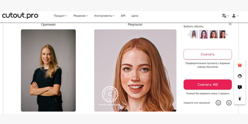 Онлайн-сервис для визуального дизайна на базе нейросети, с помощью которого можно дорабатывать изображения: работать с фоном, убирать шумы, увеличивать разрешение картинки, делать стилизацию.