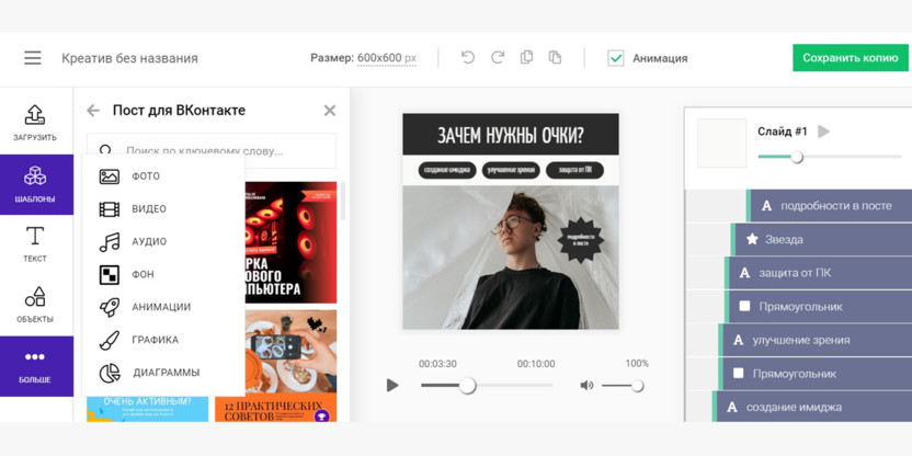 В онлайн-редакторе большая библиотека шаблонов, пользоваться им можно бесплатно, но если хотите получать креативы в высоком разрешении и без логотипа сервиса – нужно оформить подписку. Она также откроет доступ к более широким возможностям: