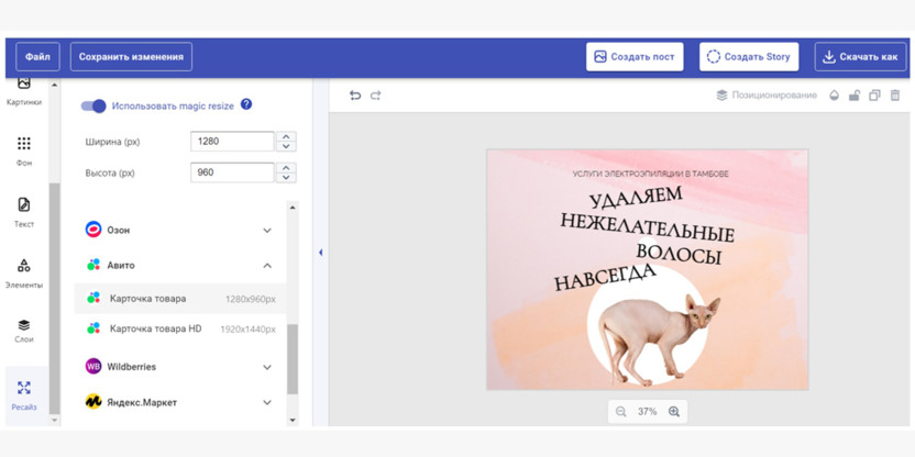 «ресайз» – меняет размер креатива под конкретный тип публикации в выбранной соцсети;