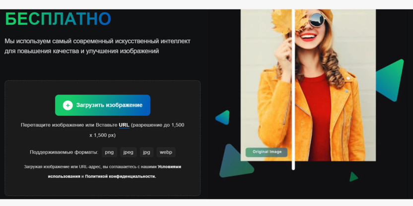 Чтобы увеличить разрешение картинки плохого качества, нажмите «Загрузить изображение» и дождитесь результата