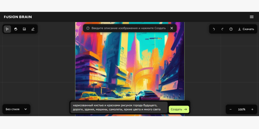 При генерации изображений по текстовому описанию важно указывать как можно больше деталей: технику изображения, материалы, идею, детали на рисунке, цвета. Результат будет доступен для скачивания в формате PNG