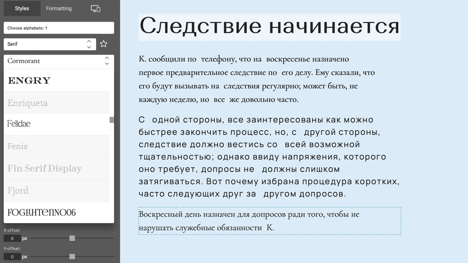 готовые стили текста, наборы шрифтов и возможность загружать собственные;