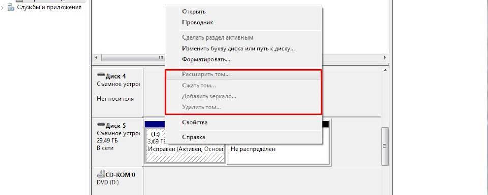 Итак, мы видим что флешка (в моем случае это EOS_DIGITAL J:), поделена весьма странным образом. Половина занята активным разделом, и половина флешки просто не размечена. Кликаем на активном разделе и видим грустную картину — мы не можем ни удалить этот раздел, ни расширить его на весь объем флешки.