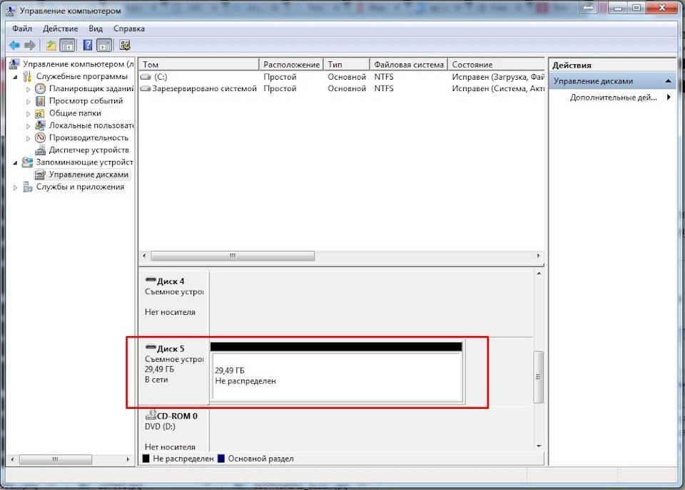 С этим разобрались, что дальше? Далее мы должны снова зайти в утилиту «Управления дисками»