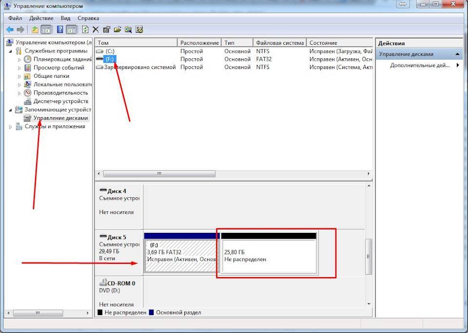 Итак, смотрим на список и ищем свою флешку. Моя на 32Gb, и из списка под этот объем подходит только Диск5, Диск0 явно больше и это основной мой хард.