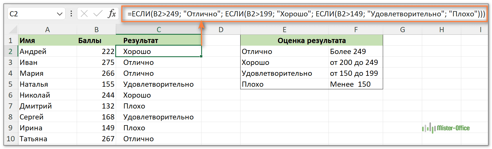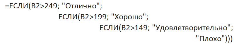 ЕСЛИ( проверяем, если B2>249; если ИСТИНА — возвращаем «Отлично», иначеЕСЛИ ( проверяем, если B2>199; если ИСТИНА — возвращаем «Хорошо», иначеЕСЛИ ( проверяем, если B2>149; если ИСТИНА — возвращаем «Удовлетворительно», если ложно — возвращаем»Плохо»)))