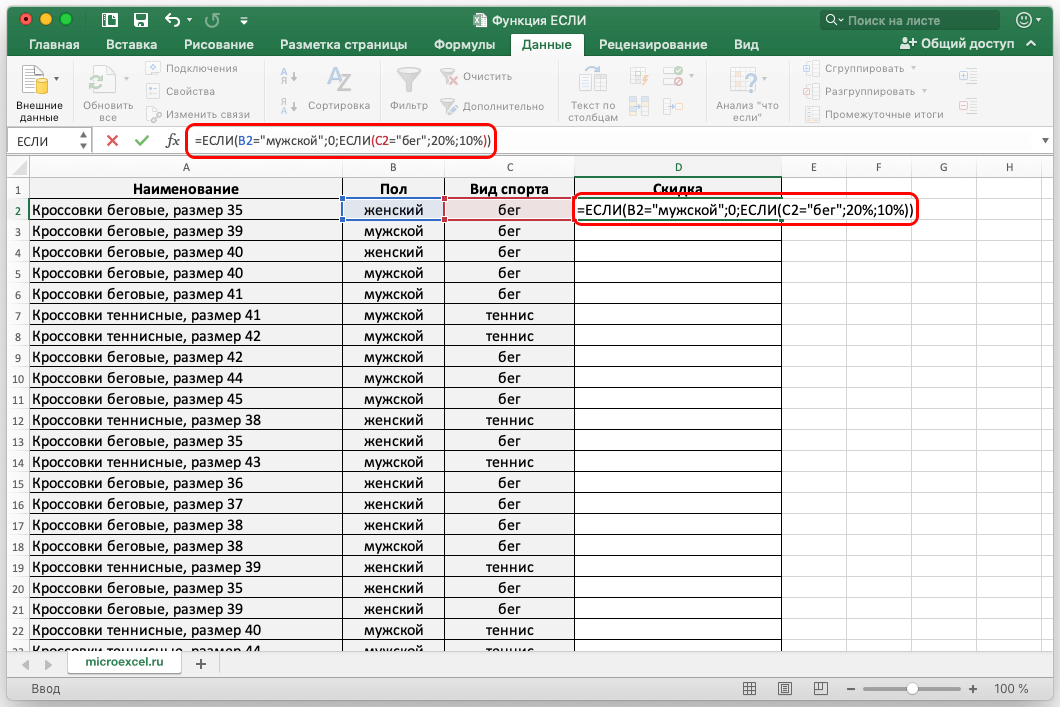= IF(B2=»мужчина»;0; IF(C2=»бег»;20%;10%))