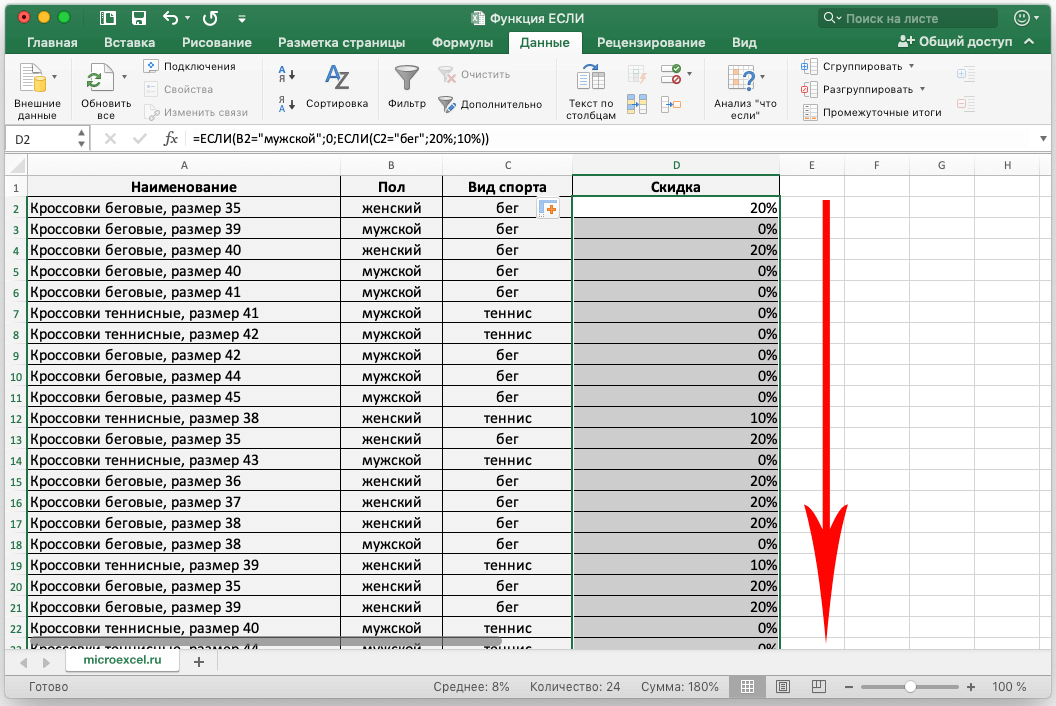Первое условие — проверка пола. Если это «мужчина» — сразу же отображается значение 0. Если это «женщина», то начинается вторая проверка условия. Если спорт — бег — 20%, если теннис — 10%.